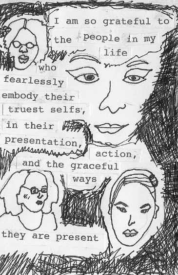 This is the back page of the zine–I can finally reveal who my terrible line drawings are of! Shout outs to a few of the beautiful people in my life who inspire me always: marcus, davend, katie, and becky–you all express yourself in ways that make me feel a little more brave.